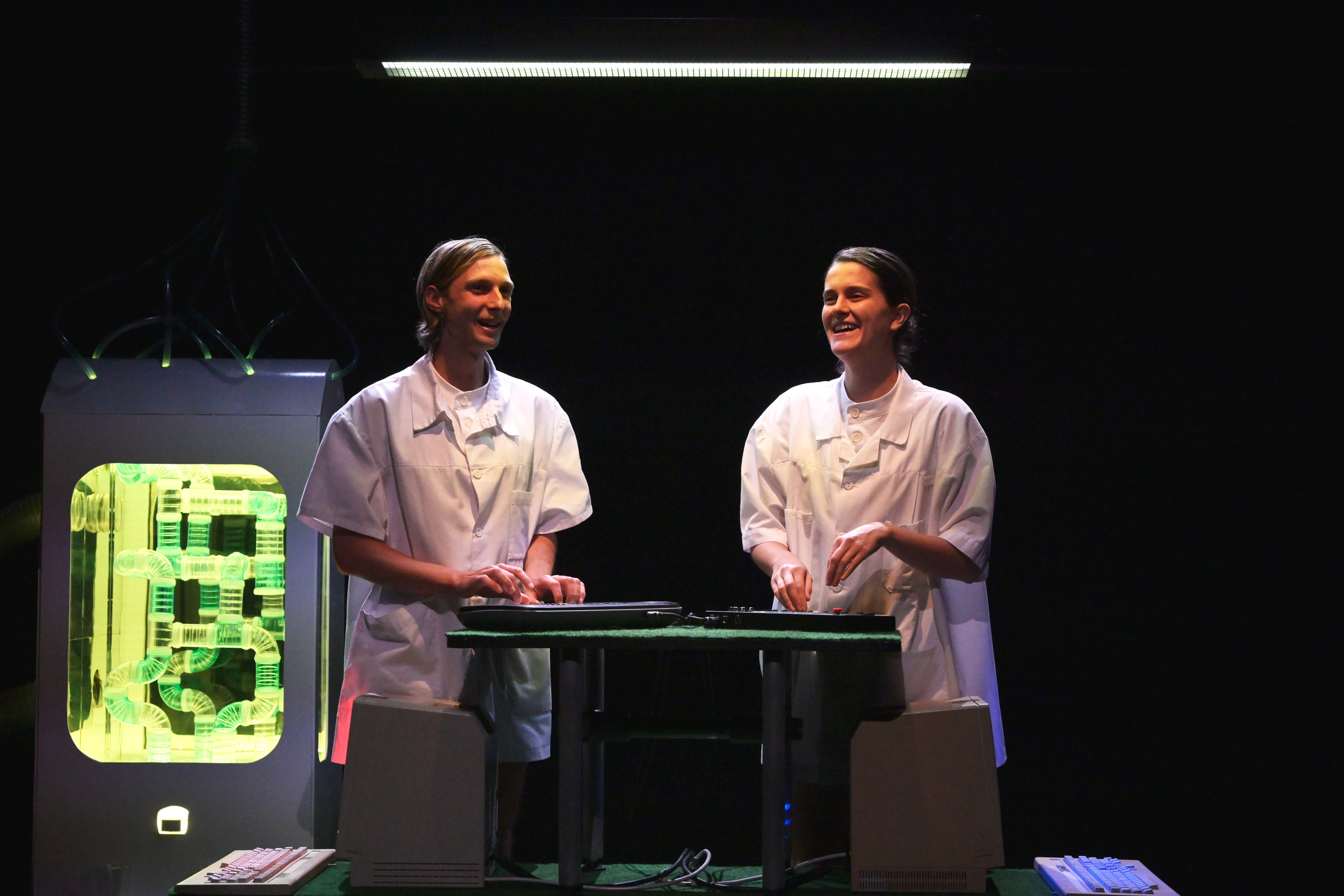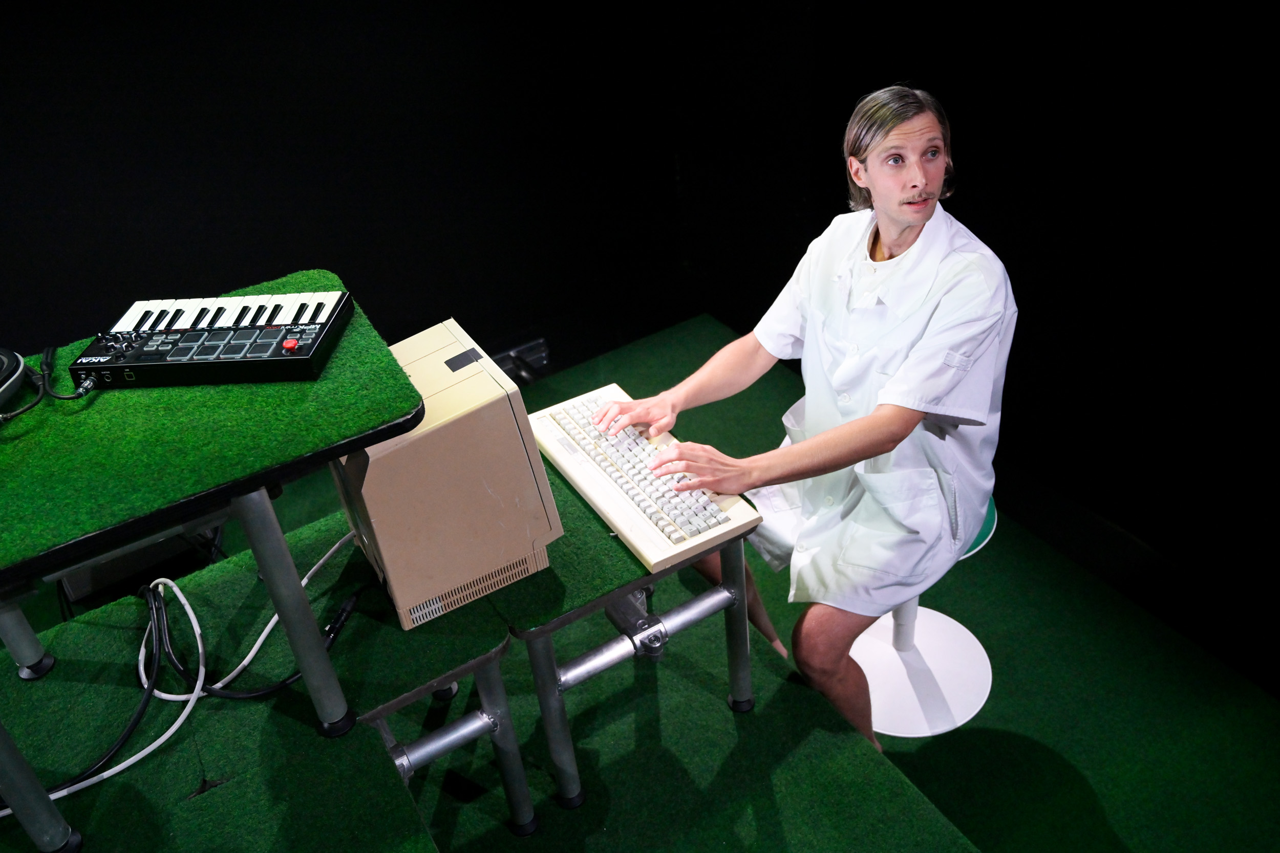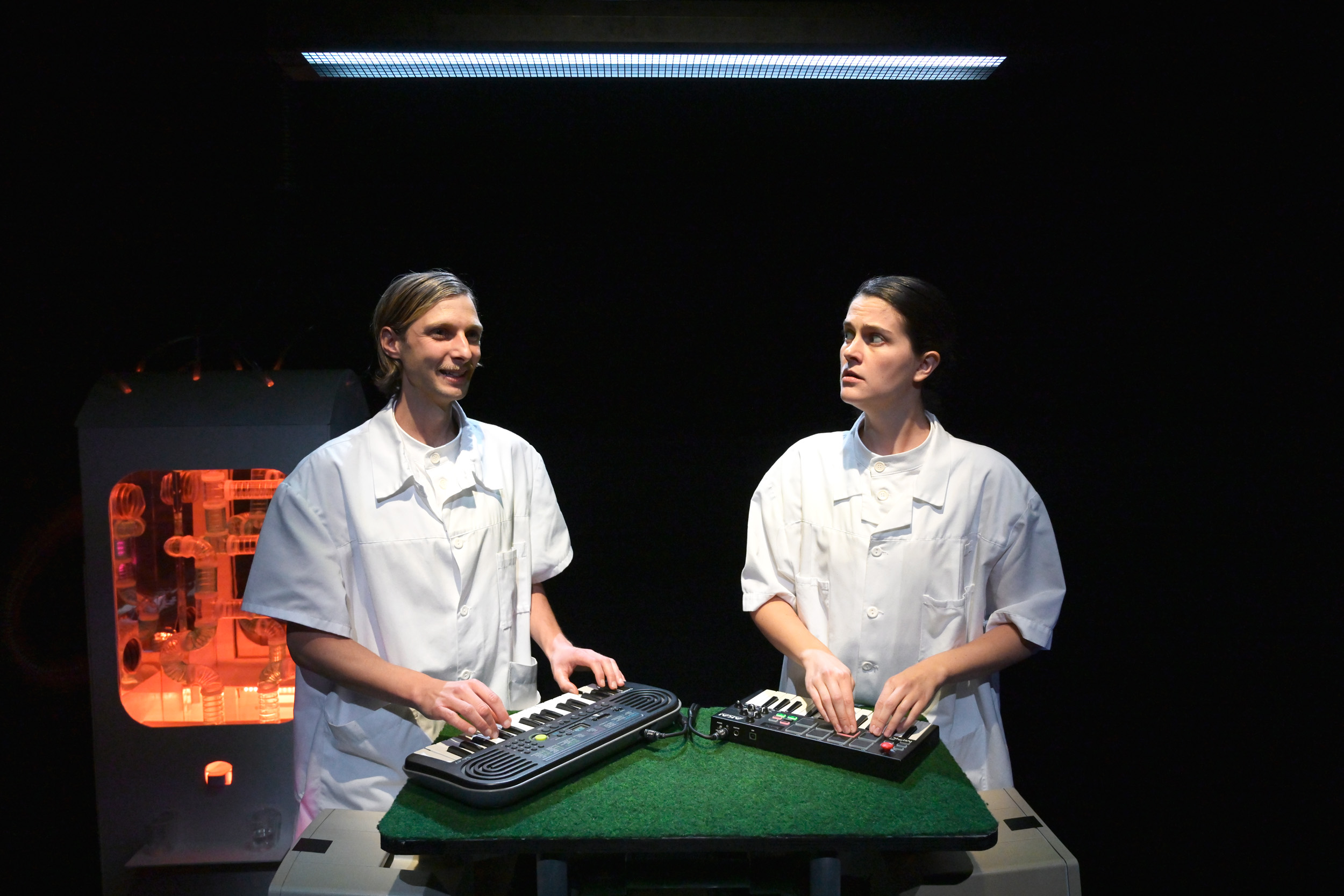 Sur scène se compose un univers intimiste, sorte de cage à hamster flottante dans la galaxie. Une structure plastico-métallique recouverte de fausse végétation autour de laquelle évoluent un étrange duo, blouses de laboratoire et jambes nues. Entre les pauses au distributeur automatique et les séances de cardio, iels rapportent avec précision le quotidien en apparence banal d’un hamster adepte de littérature et de vol à l’étalage. Le récit est ponctué par des jingles obstinés qui raisonnent dans cette cage crânienne et les invitent fermement à se mettre au travail. Obéissant·es, iels s’y plient avec ferveur. Mais quand le hamster manifeste les signes d’une sévère baisse de moral, leur routine bien huilée et leur éthique sont mises en péril. Ces deux personnages aliénés sont alors contraint·es de prendre de la distance vis-à-vis des activités quotidiennes futiles qui rythment leur existence.