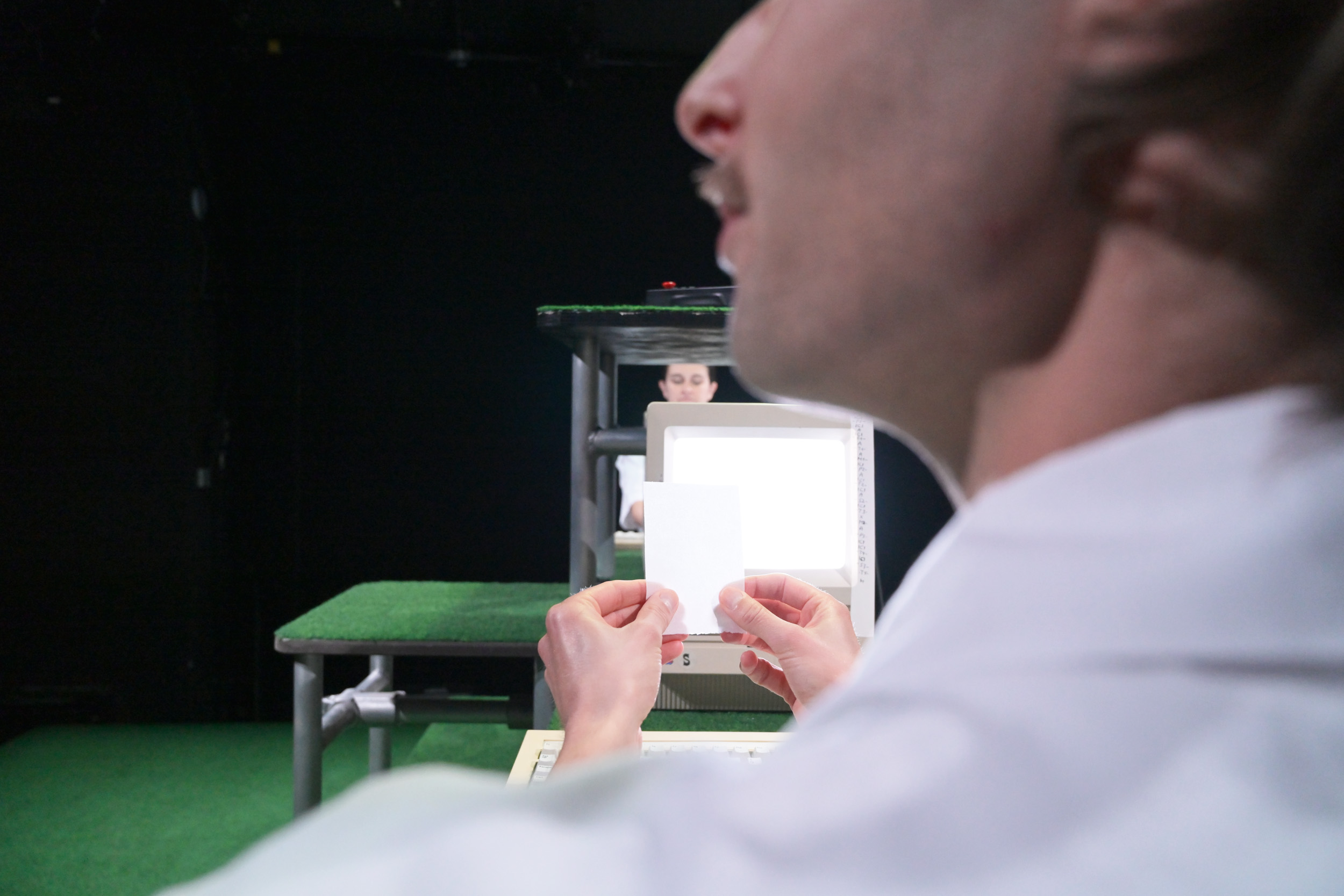 Sur scène se compose un univers intimiste, sorte de cage à hamster flottante dans la galaxie. Une structure plastico-métallique recouverte de fausse végétation autour de laquelle évoluent un étrange duo, blouses de laboratoire et jambes nues. Entre les pauses au distributeur automatique et les séances de cardio, iels rapportent avec précision le quotidien en apparence banal d’un hamster adepte de littérature et de vol à l’étalage. Le récit est ponctué par des jingles obstinés qui raisonnent dans cette cage crânienne et les invitent fermement à se mettre au travail. Obéissant·es, iels s’y plient avec ferveur. Mais quand le hamster manifeste les signes d’une sévère baisse de moral, leur routine bien huilée et leur éthique sont mises en péril. Ces deux personnages aliénés sont alors contraint·es de prendre de la distance vis-à-vis des activités quotidiennes futiles qui rythment leur existence.
